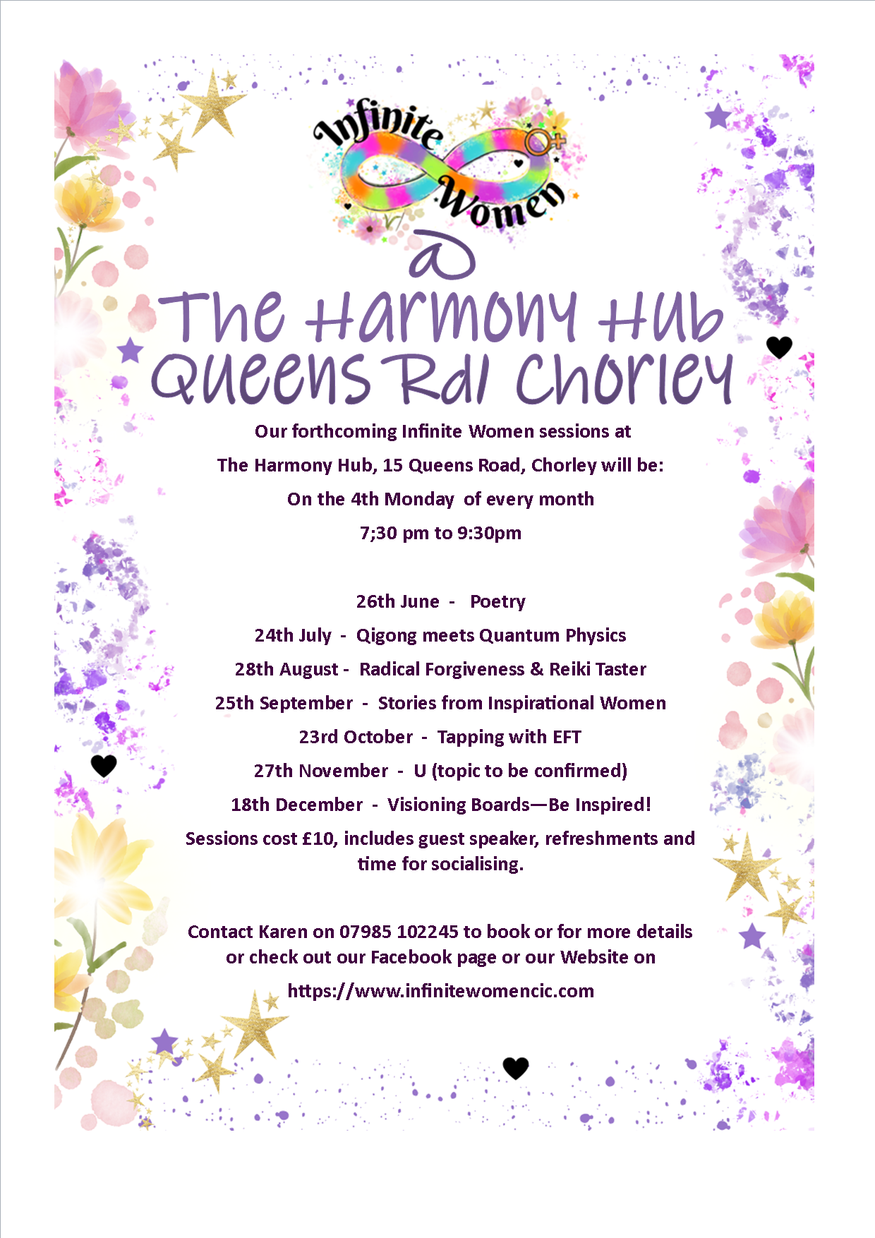 Don't miss out on this wonderful chance to contribute to a more harmonious loving world ! for further information contact gerry.infinitewomencic@gmail.com and to book at a local venue please contact Karen on 07985 102245 by TEXT